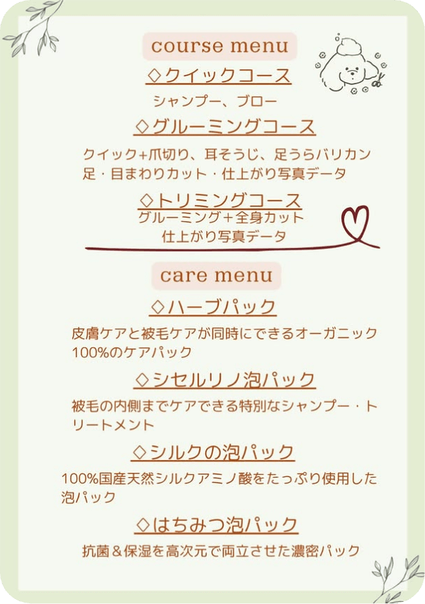 初回サービスの選べるケアメニューワンちゃんの肌に合わせておすすめしたいケアを提案いたします